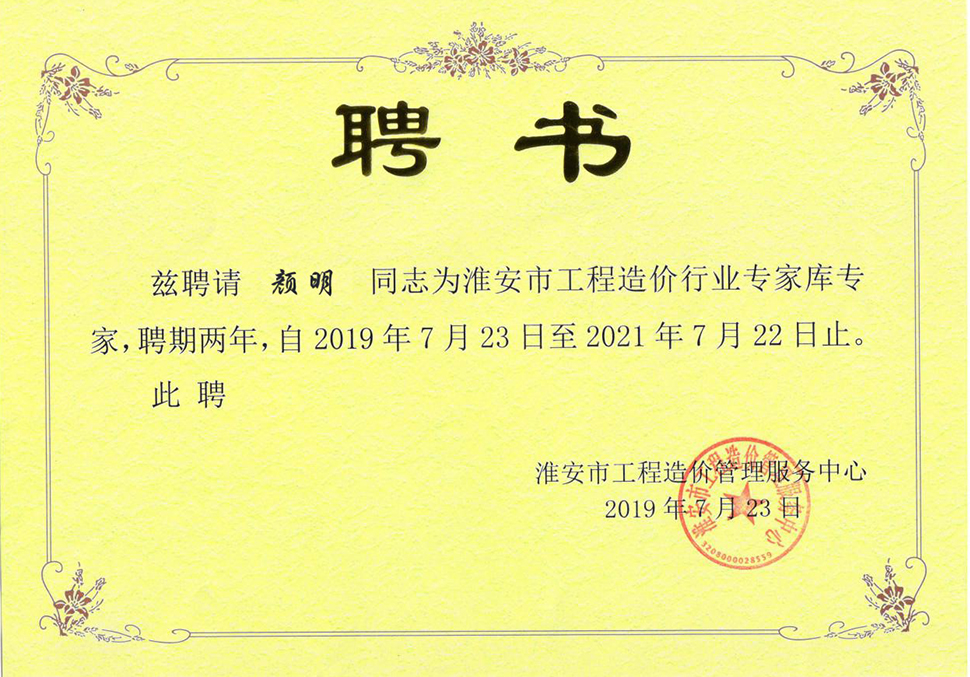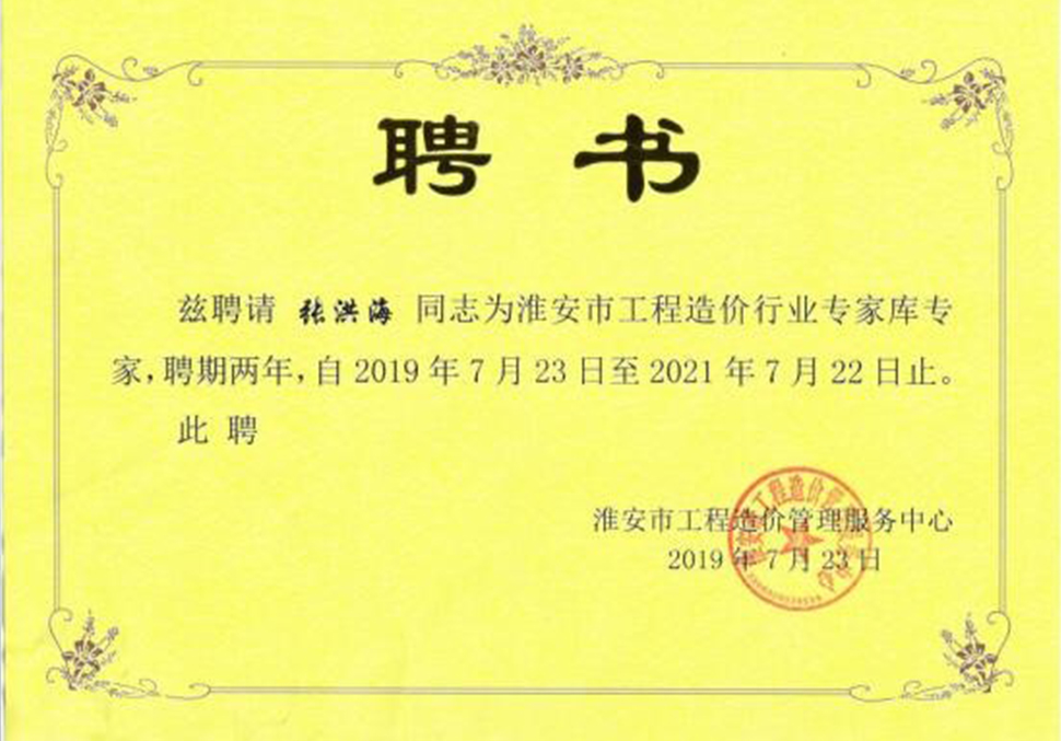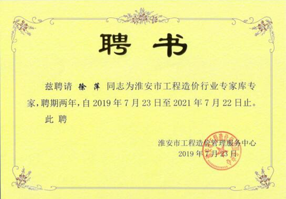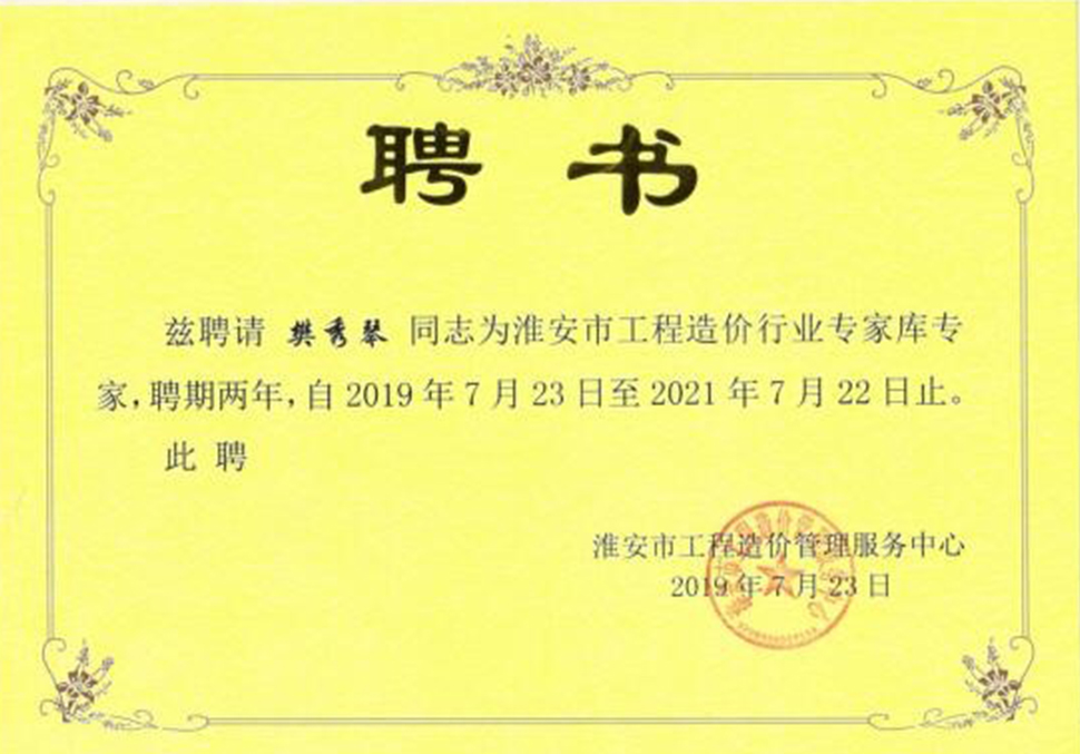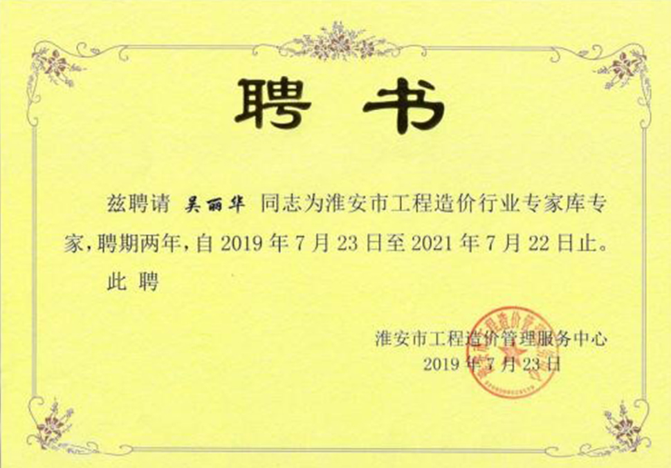 2019年7月23日我司六位具备高级工程师、注册造价师的张洪海、徐秀英、郑红云、徐萍、吴丽华、樊秀琴、颜明等六人收到了聘书,成功入选淮安市工程造价专家库。对以上人员表示祝贺!