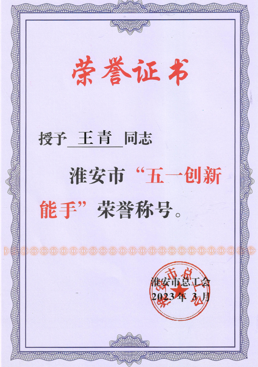 我司王青同志荣获淮安市“五一创新能手”荣誉称号