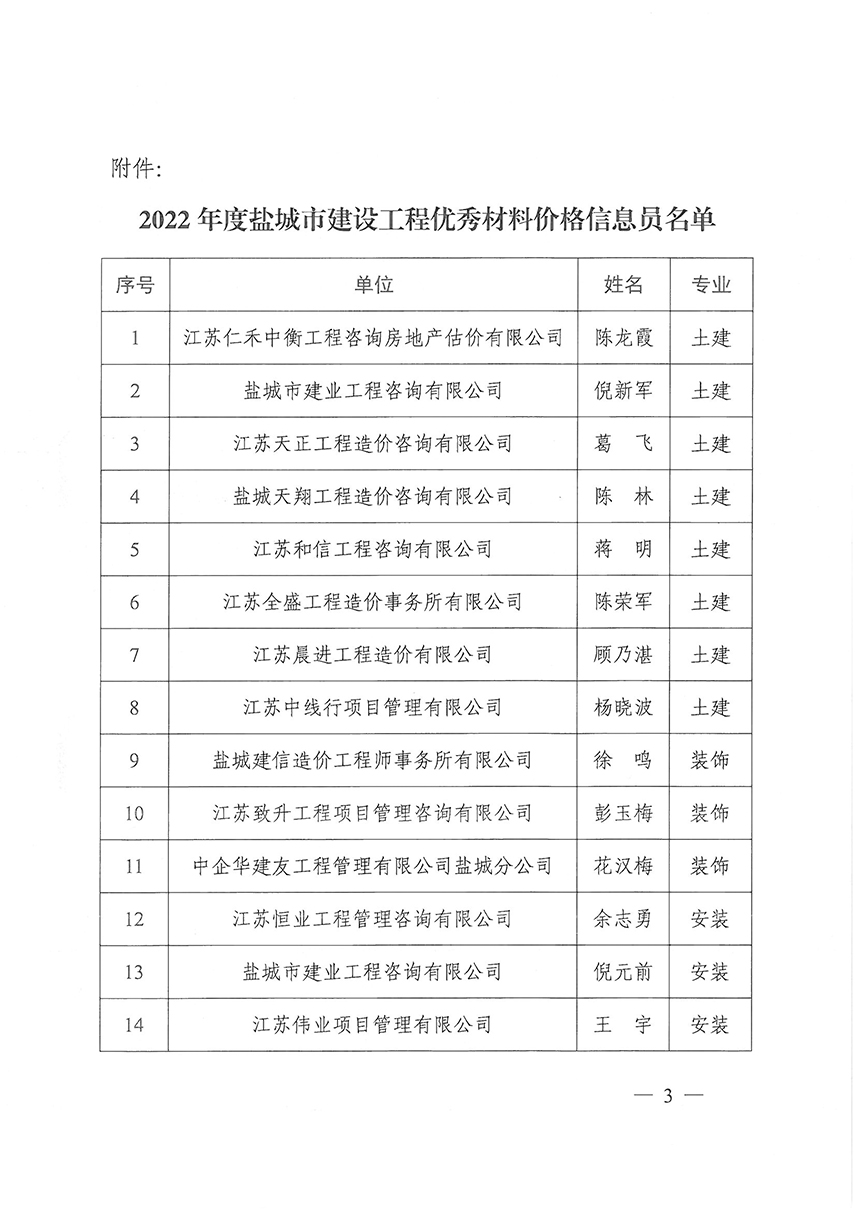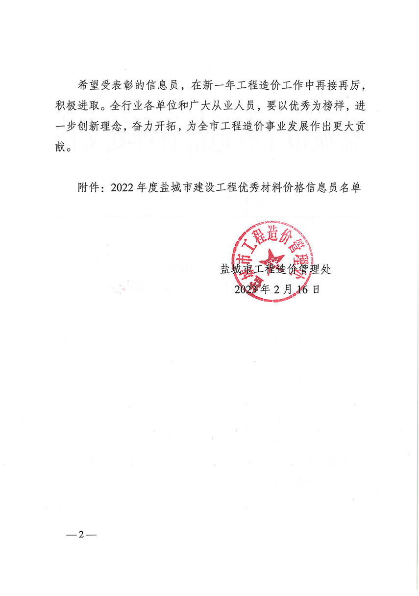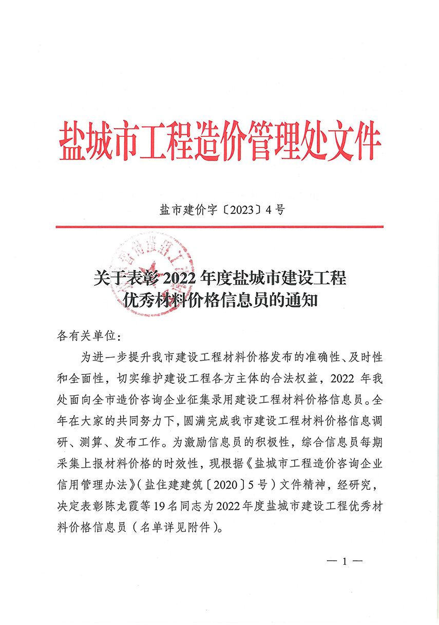 关于表彰2022年度盐城市建设工程优秀材料价格信息员的通知